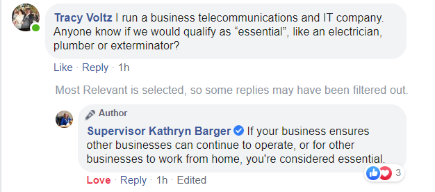 Per Los Angeles County Supervisor Kathryn Barger, who answered UCI President Tracy Voltz’s question via Facebook, UCI is considered an essential business as we help keep other businesses operational.